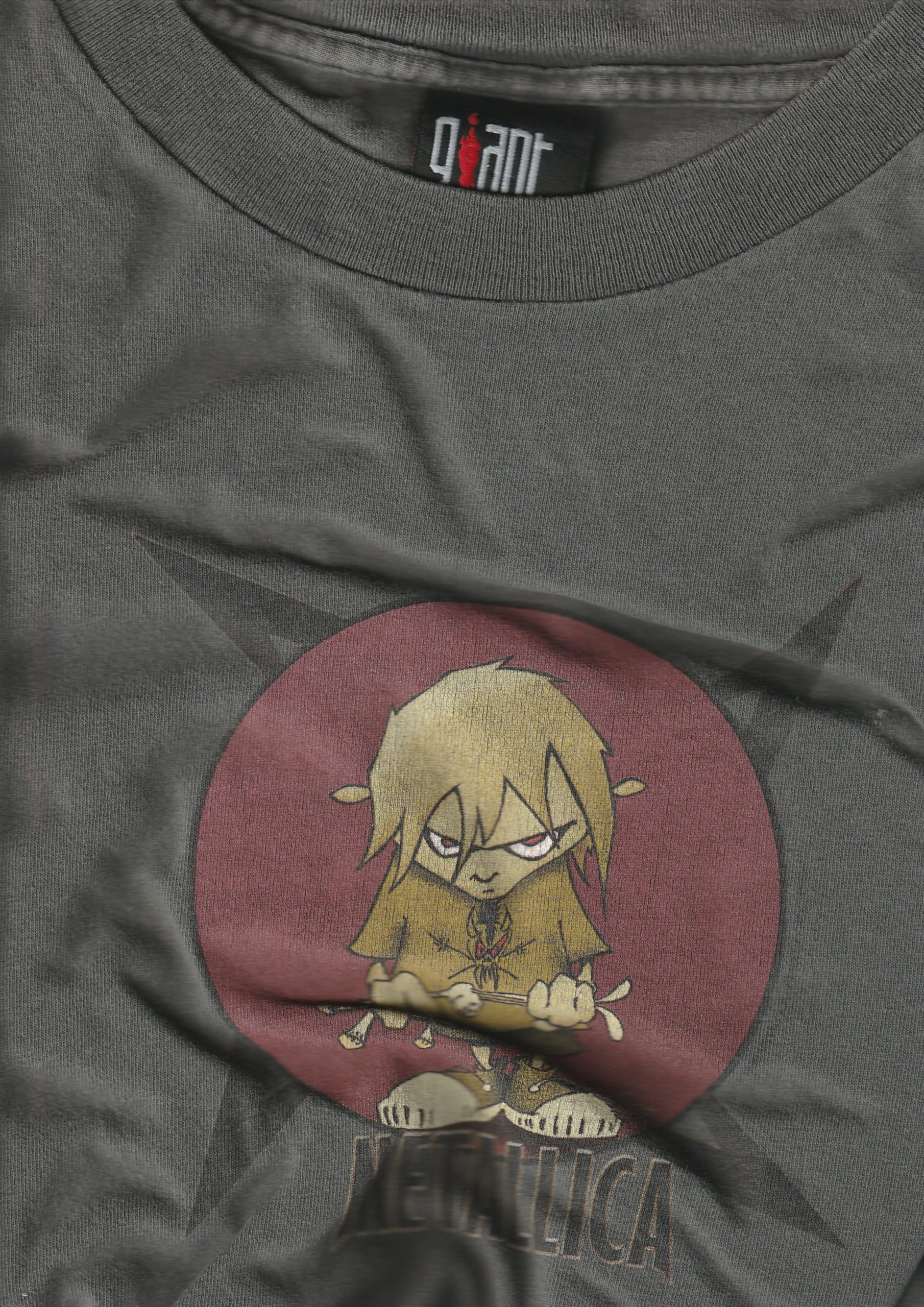 Metallica 1999 tee featuring a unique anime-style “chibi” character graphic — a playful twist on the band’s heavy image. Printed on an original Giant tag, known for its thick cotton and boxy fit that defines authentic.